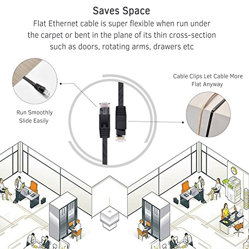 ✔Flat Cat 6 cable design helps avoid tangled cords and saves space.Flat Ethernet cable is super flexible when run under the carpet or bent in the plane of its thin cross-section such as doors, rotating arms, drawers etc