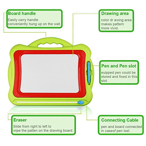 MegaToyBrand Magnetic Drawing Board Kids Magna Doodle Erasable Writing Sketch Board PadMULTI COLOR 8 COLOR ZONES AND 4 COLORS: The magnetic writing screen is divided into 4 colors, Blue and Yellow on top and Red and Green on the bottom; colorful drawing board to inspire children to explore imagination and creativity with endless opportunity.