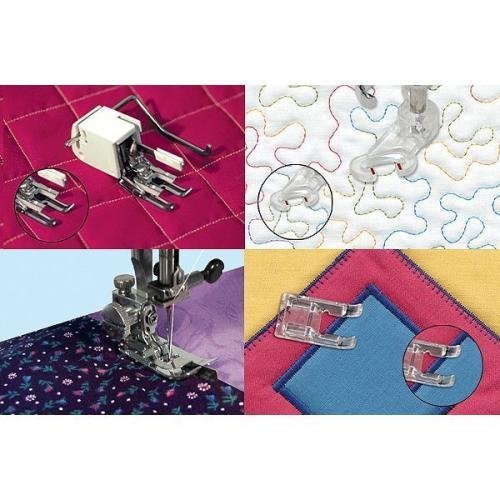 -. Feature : Open-toe walking foot keeps quilting layers feeding evenly to ensure evenly spaced lines / Open-toe darning foot for free-motion quilting and embroidery techniques / Open-toe craft foot for quilting, cutwork, applique and other decorative stitches / Ditch-quilting foot with center-position metal blade that follows stitching line precisely