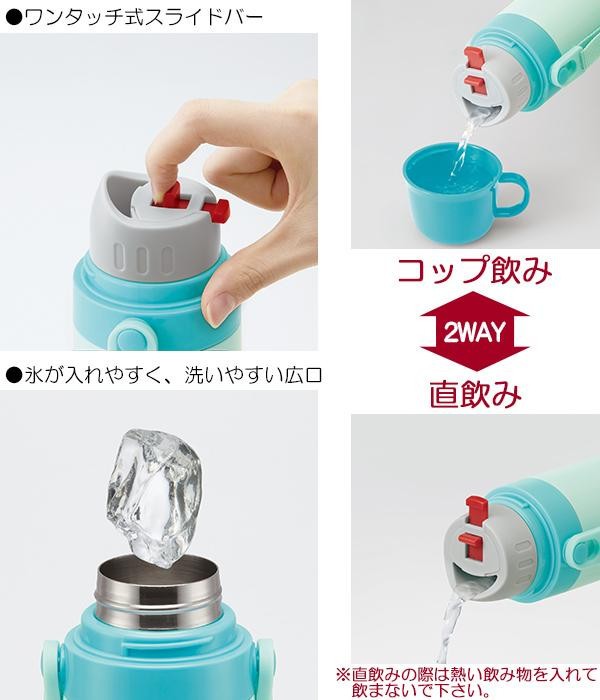 直接口を付けて飲む水筒としても、コップに入れて飲む水筒としても使える2WAYのステンレスボトルです。氷を入れやすい広口タイプで、ワンタッチ式のスライドバーで飲み方をお選びいただけます。