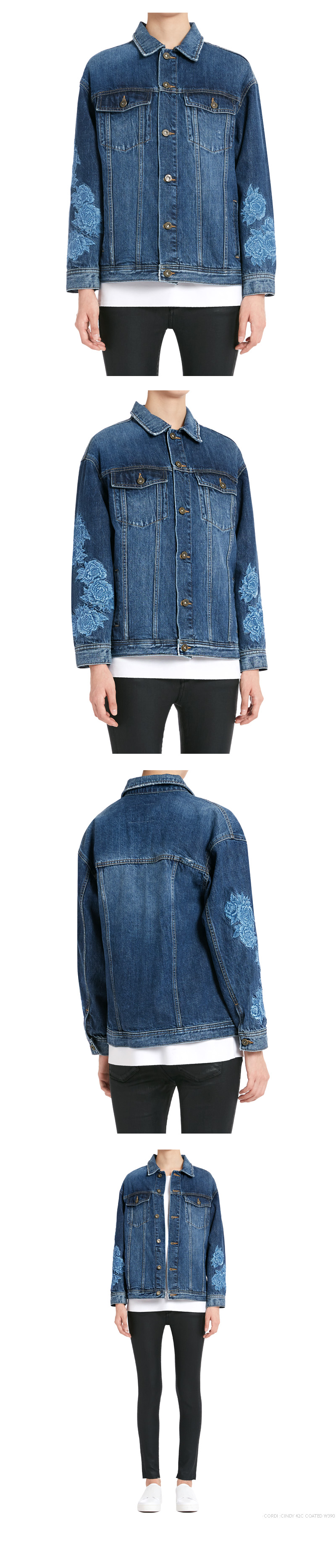| ? | - 빈티지한 중간인디고 컬러의 DENIM JACKET - 소매쪽의 블루계열의 자수로 트렌디하며 컨템포러리한 느낌 - 13 OZ 의 사방원단 슬럽의 원단을 사용하였으며, 박시한 룸의 데님 자켓 - COTTON 100% |