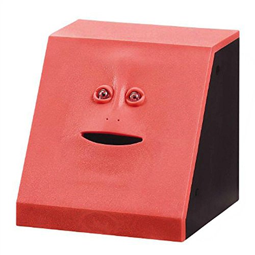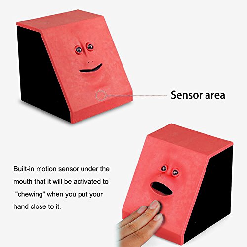 Features: * Put your coin on its mouth, and the face bank will "eat" it to its tummy * Not only help your kids save money, but also provide lots of fun * Built-in motion sensor under the mouth that it will be activated when you put your hand close to it * Elastic rubber face give you a good hand feeling * Requires 2pcs AA batteries. (NOT Included) * 4 anti-skip leg on the bottom * Long operating life * Fits almost every type of standard coin * Makes for a great office and/or reception desk novelty * Great gift to teach kids of all ages how to save money! * Fun way to save money and keep all your loose change, a perfect gift saving pocket money for the kids