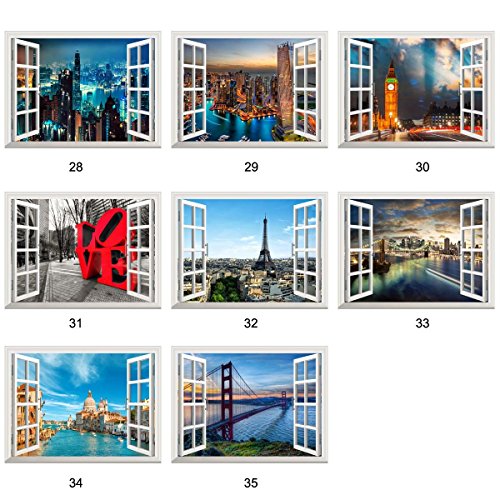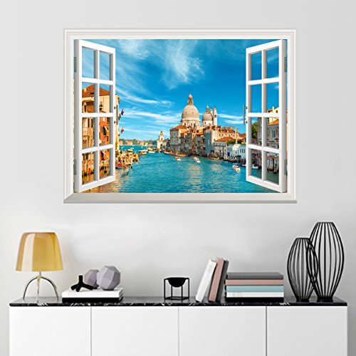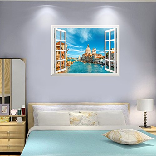 Uniquebella 3D Wall Decals Stickers Scenery Views Of Venice False Faux Window Mural Bedroom Window Wall Sticker Living Room