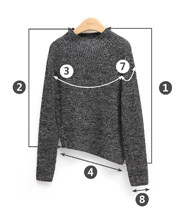 | 尺码 | ①前左衣长 | ②前右衣长 | ③胸围 | ④前摆围 | ⑤后摆围 | ⑥袖长 | ⑦袖臂围 | ⑧袖口围 | ||