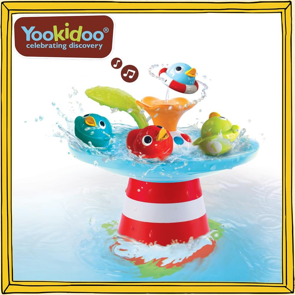 電池の力で水を汲み上げるモーターが付いた音楽を奏でる本体と個性豊かな4匹のあひるがセットになったお風呂で遊ぶおもちゃです。本体のお花噴水口にあひるをセットすると、いろいろな噴水パターンが楽しめます。本体トレーにあひるを置いてスイッチオン!!楽しい音楽を奏でながら、にぎやかな追いかけっこの始まりです。噴水の出方を工夫して楽しみながら学べます。 |