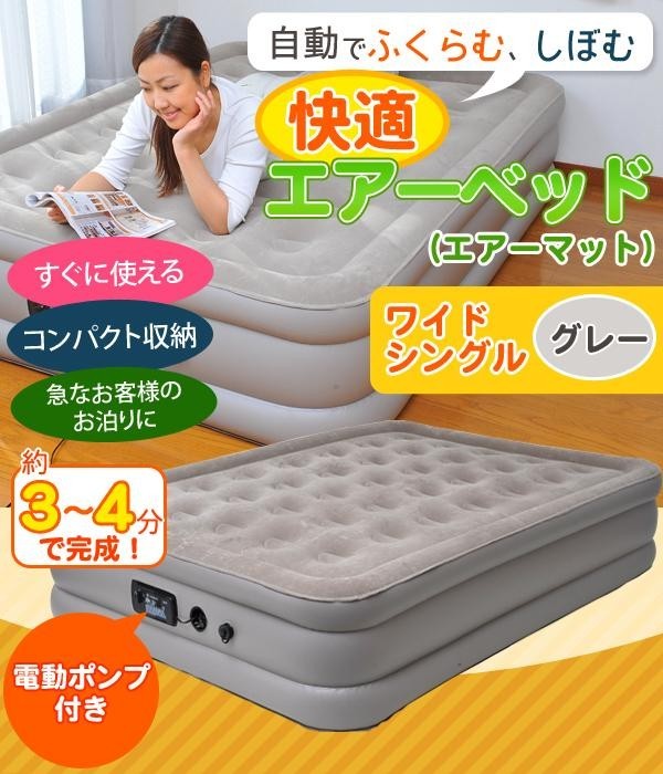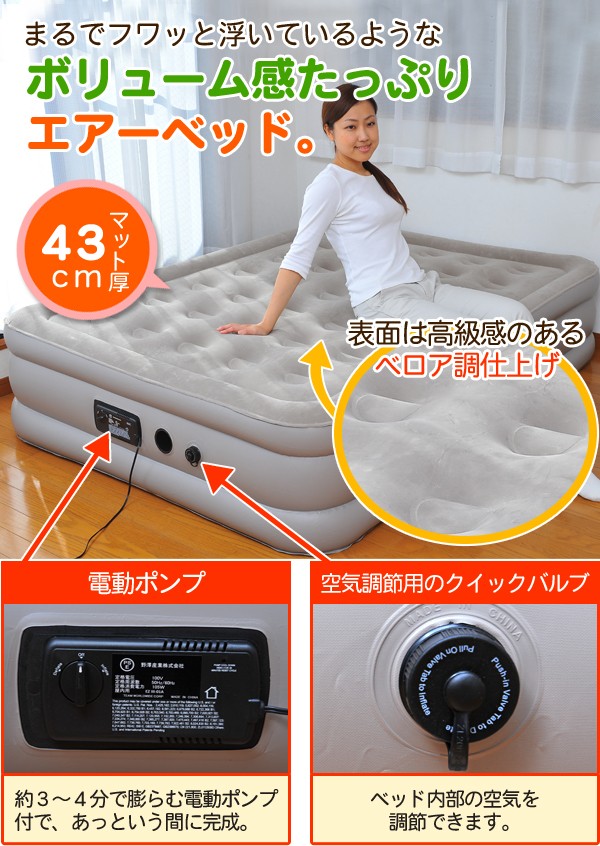 | 自動で空気が入り、約3~4分で完成するエアーベッド。空気抜きも自動でできるので簡単!!空気調節用の大型クイックバルブで空気の調節ができます。マットは、ひんやりしないベロア調の微起毛仕上げ!!ボリュームのあるマットは、むだ揺れしにくくどっしりと安定!!エア3層の立体構造ですぐれた安定感を実現!!急な来客時に便利です!! |