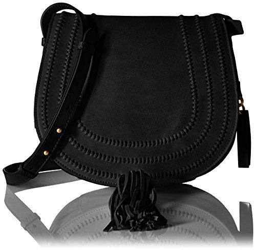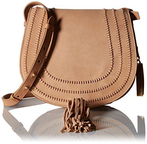 Saddle-shape bag featuring hanging tassel trim and foldover flap embellished with three rows of woven trim