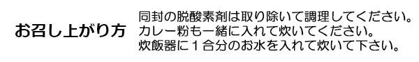 | 原材料 | 名称:穀類加工品 精米(新潟県産)、玄米(国内産)、乾燥人参(人参、ブドウ糖)、乾燥ごぼう(ごぼう、ブドウ糖)、生姜、カレー粉(原材料の一部に小麦を含む) |