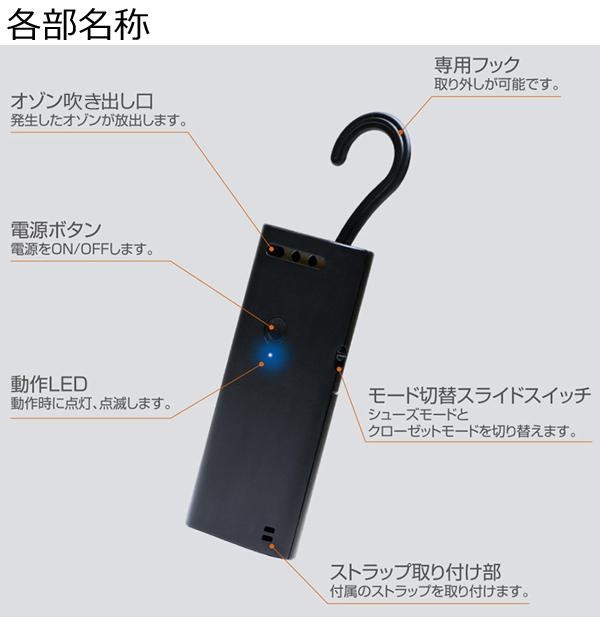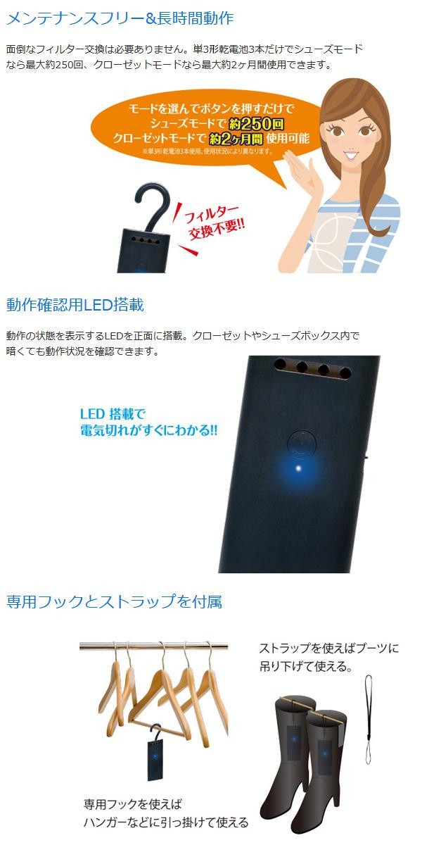 | 脱臭効果の高いオゾンを使って、クツやシューズボックス、クローゼットの脱臭ができます。オゾンは時間とともに安定した酸素に戻るため、消臭剤などと異なり、薬品などが残留する心配がなく、安心して使用できます。単3形乾電池3本だけで使用できるので経済的に使用可能です。 |