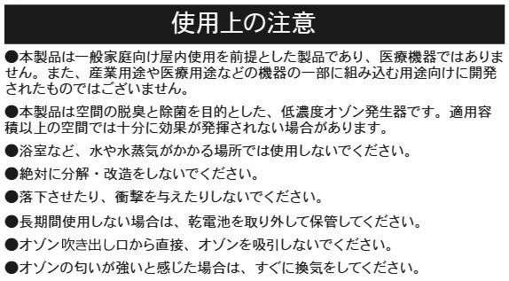 脱臭効果の高いオゾンを使って、クツやシューズボックス、クローゼットの脱臭ができます。オゾンは時間とともに安定した酸素に戻るため、消臭剤などと異なり、薬品などが残留する心配がなく、安心して使用できます。単3形乾電池3本だけで使用できるので経済的に使用可能です。 |