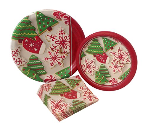 -. Feature : Sugar cookie paper product bundle includes: 8 dinner plates, 8 dessert plates, & 16 napkins / Dinner plates measure 8 3/4" round / Dessert plates measure 6 7/8" round / Products feature Holiday Treats theme with Christmas trees, mittens, and snowflake cookies / Great for Christmas or cookie exchange party