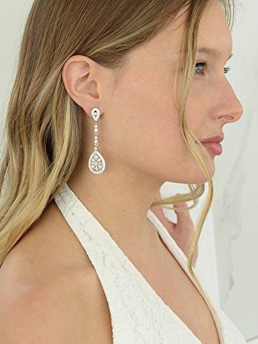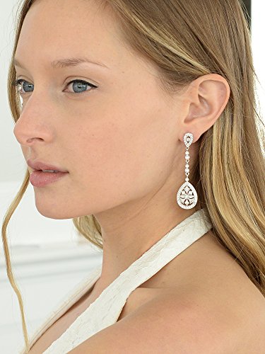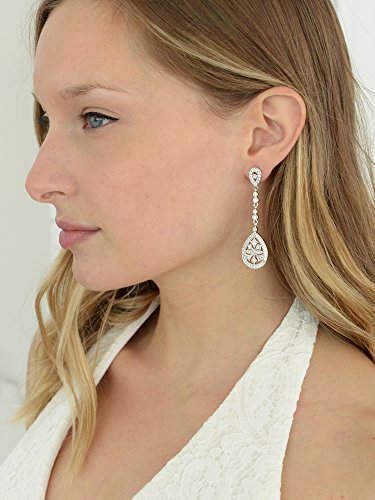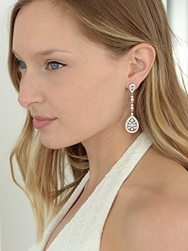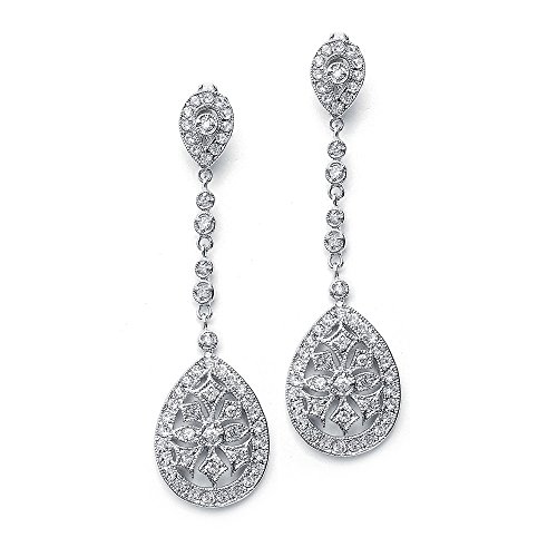 Mariell's dramatic Art Deco wedding earrings will bring glamorous vintage styling to your bridal, bridesmaids or any special occasion gown. We love the timeless elegance of these classic 1920's-inspired chandeliers. Their sleek linear silhouette with meticulously etched pave teardrop sparkle with Genuine Cubic Zirconia. These timeless pear-shaped wedding earrings have the unmistakable look of priceless heirloom jewelry. Make an unforgettable grand entrance in these jewel-encrusted antique dangles measuring 2 1/2" h. After the big day, wear these versatile chandelier earrings for a night on the town or romantic candlelight dinner. Add a fabulous splash of bling to your everyday wardrobe with these versatile faux marcasite favorites. With AAAAA CZ gems and Genuine Platinum plating, these beauties have the look of fine jewelry at a fraction of the cost. Mariell's unconditional Lifetime Guarantee, our lustrous stunners will become a treasured addition to your jewelry collection for years to come. We promise you'll adore these top selling gatsby-style earrings or your Money-Back. Treat yourself or someone you love to some seriously gorgeous sparkle with the look of priceless estate jewelry at a fabulous low price. As always, enjoy Mariell's exclusive 100% Risk-Free Purchase and Lifetime Guarantee.Feature