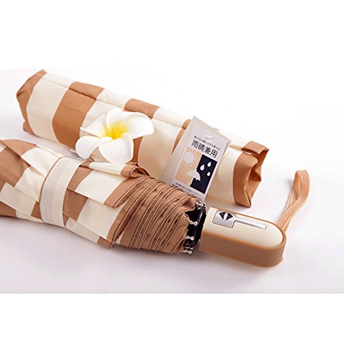 -. Feature : UPF:>40+, AV:<5%, suitable for sunny and rainy day / Material: High quality pongee and aluminium alloy for durable usage / Dimension: Closed length: 11" / 28cm, Opened length: 22" / 57cm, Coverage Diameter: 38" / 98cm, Canopy arc: 42" / 108cm / The automatic design with anti-slip rubberized grip for your easy on / off and a long time holding, convenient to use and carry / Strong stainless steel center pole and 8 anti-rust aluminum ribs withstanding high wind and preventing the umbrella from flipping inside out
