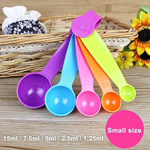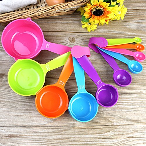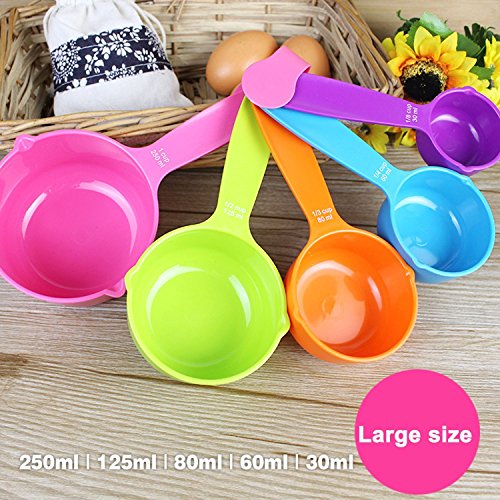 ALL IN 1 SET--5 Measuring cups: 1 cup (250ml), 1/2 cup (125ml), 1/3 cup (80ml), 1/4 cup (60ml) and 1/8 cup (30ml); 5 Measuring spoons: 1/4 tsp (1ml), 1/2 tsp (2.5ml), 1 tsp (5ml), 1/2 Tbsp (7.5ml) and 1 Tbsp (15ml).The color of measuring spoons and cups set are different in your hands because plastic measuring spoon and cup set colors was randomly distributed(10 pcs/set)