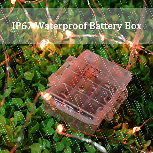 - WATERPROOF AND DURABLE: The battery case is compact of IP65. It can be used outside, even in a rainy day. But do not put it under water directly for a long time. Each light consists of 4 sturdy insulated silver wires which won't get overheated after long-time use.
