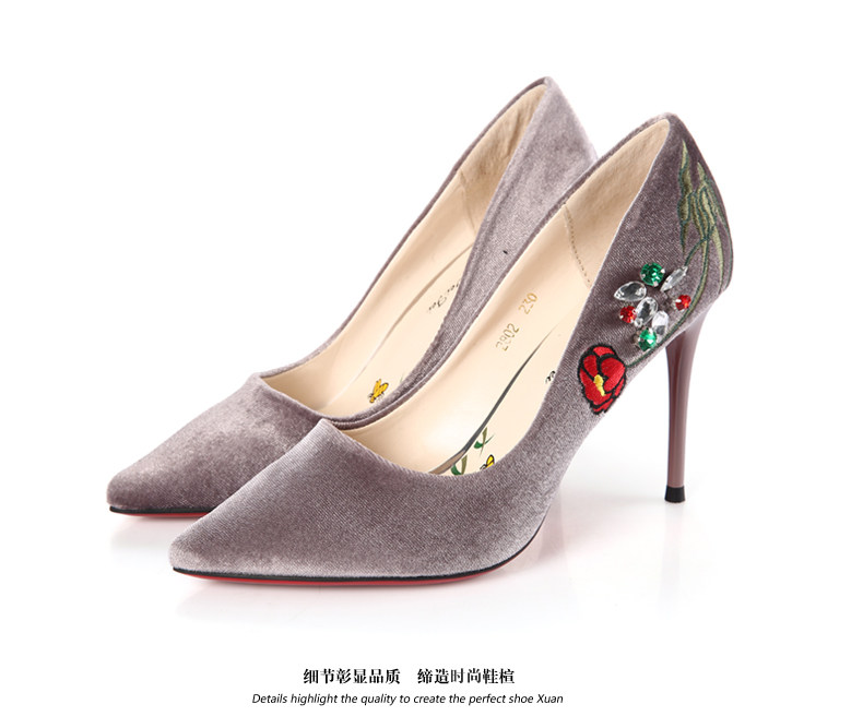 浅口鞋公主春秋女鞋细跟尖头绒面真皮甜美绣花高跟单鞋性感水钻