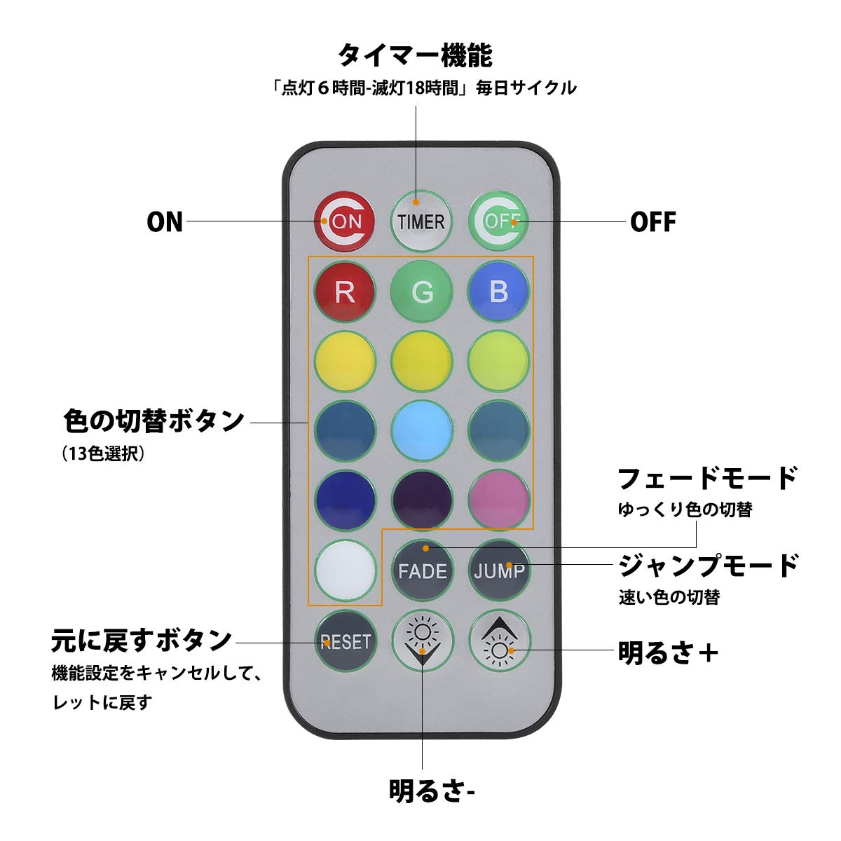 ★21key モートコントロール、タイマー機能と輝度レベルコントロール、制御しやすく、エネルギー効率が高い、1回のプレスで好みの色と明るさが得られます。