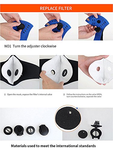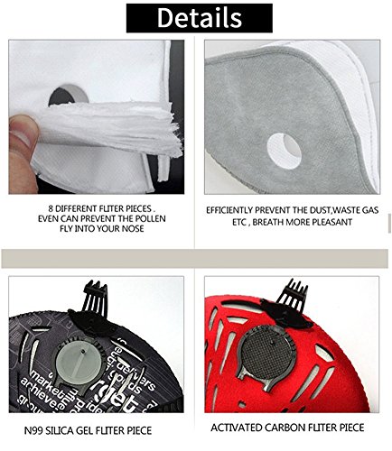 -. Feature : Active carbon filters isolate 95-percent of dust, chemicals, fumes and particulates,especially for those who in pollen allergy have a significant role. / The perfect combination of ergonomics, size can be adjusted to meet the most head type.According to the person face design, keep out the bridge of the nose the following part, have aluminum sheet fixed, to prevent the slide. / Unique ventilation design, a plurality of holes, excellent permeability, Exhale,the valve is opened without resistance,double air breathing valve, air resistance is smaller,smooth breathing. / Washable and replaceable: the workout mask's activated carbon filter is Easy to install and replaceable, offer cleaner air to protect your mouth, nose and lung. / Suitable for running, cycling, hiking, skiing and other outdoor activities. Dust mask can prevent fumes, particulates, exhaust gas, Microbial granules, sand, and also can be used in haze day.