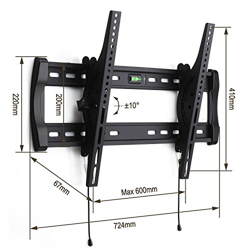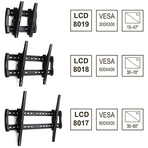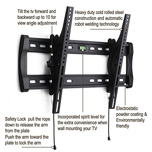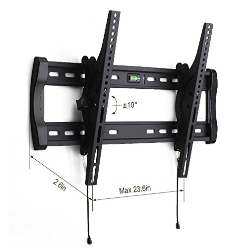 -. Feature : Universal Open Plate Design: Fits most 30"- 50"(some up to 70") monitors weighing up to 140 lbs, VESA up to 600x400 mm. Fits TVs with mounting holes as close as 4"x4" or as wide as 23.6"x15.7 (VESA 100x100mm to 600x400mm). The open plate will not block cables and cords on the back / Tilt and Profile: -10°+10°tilt for better viewing and reduce window glare. Place your TV 2.6" from the wall, leaving easy access to cables and cords / Safety Lock with easy pull down strips: Secures your TV in place from accidental lift off / Heavy gauge steel construction provides 140 lbs loading capacity. VESA plate can be taken off for easy installation by one person / Quick and easy installation: Fits 16" and 24" Wooden Studs plus Masonry, with all hardware included and pre-divided. (5 ft high speed braided HDMI cable included)