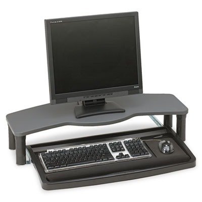 -. Feature : Comfort desktop keyboard drawer with a monitor shelf that adjusts 3 to 6-1/2 above desk surface and extra-wide 26 tray with integrated mousing area. / Features a monitor shelf adjusts 3 to 6-1/2 above desk surface. / Extra-wide 26 tray with integrated mousing area holds all keyboards, even ergonomic. / Full-length gel wrist rest and mouse pad included. / Cable management for keyboard and mouse.