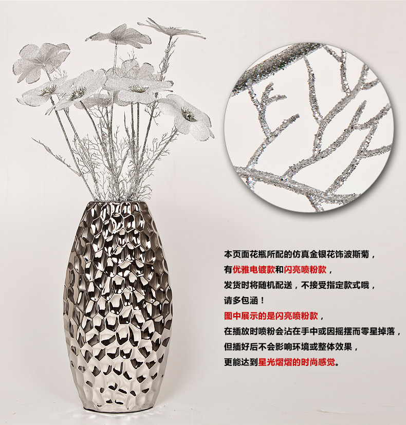 This page vase with floral simulation silver cosmos, flowerflower is elegant and bright electroplating spraying gold / silver sand shipment will be random distribution do not accept the specified styles Oh please forgive me!