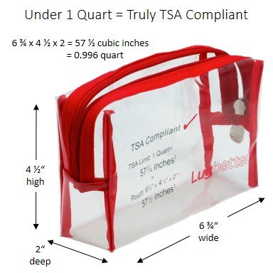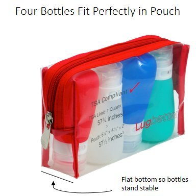 BRING ABOARD FOUR LIQUIDS: We include four, 3-oz silicone bottles in red, blue, green and clear complete with label windows to show whether the content is shampoo, conditioner, soap or lotion. They all fit into a clear pouch less than one quart in size to comply with all TSA regulations.