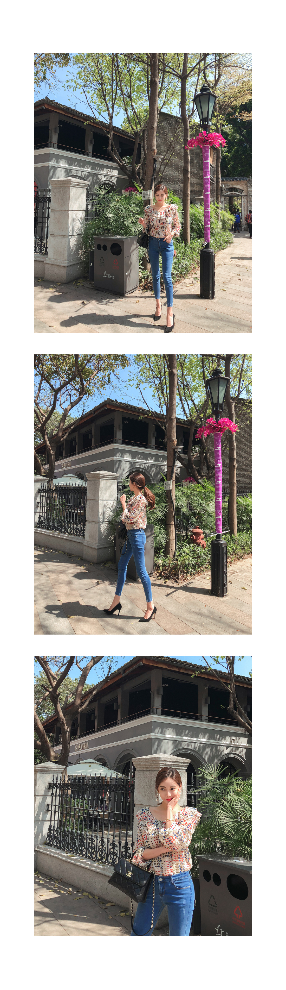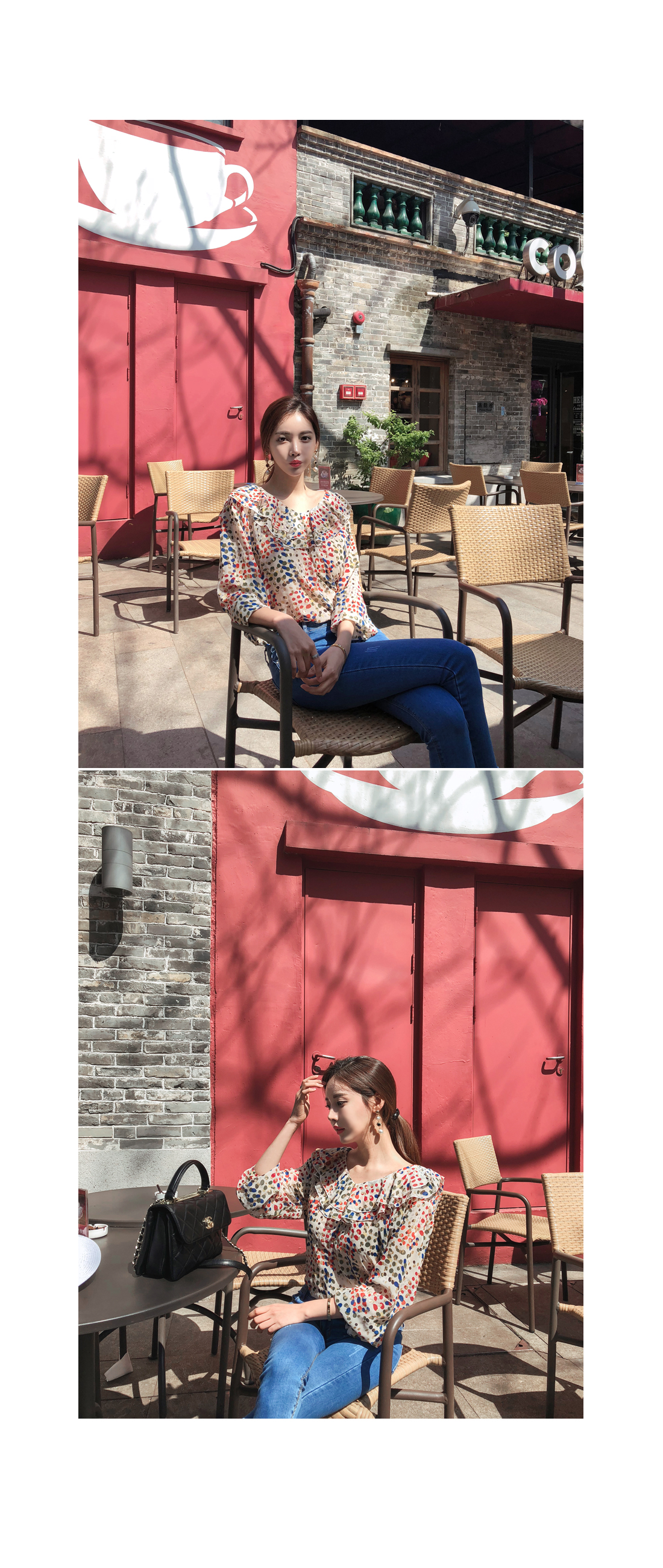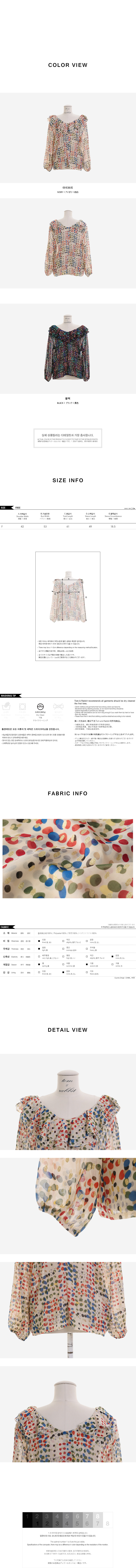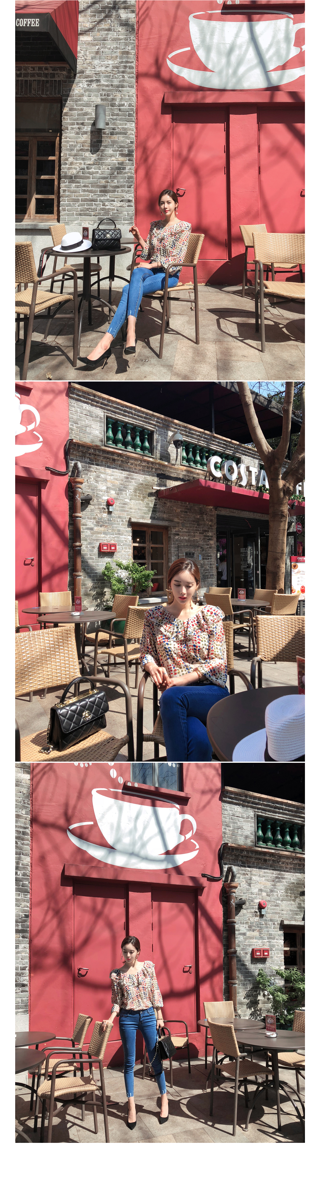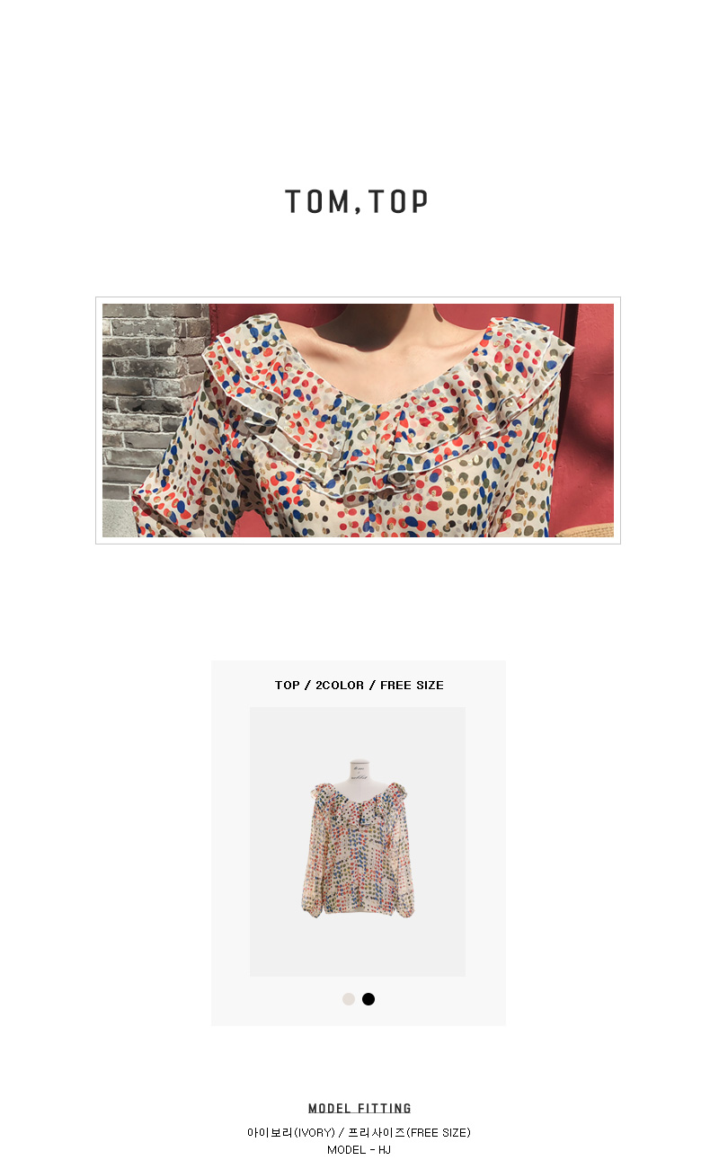 여성스러움이 물씬 느껴지는 패턴 블라우스 소개할게요.쇄골라인이 돋보이는 라운드 네크라인으로 제작되었구요따로 클로징 없이도 손쉬운 탈,착용을 도와드리구요!전체적으로 여유있는 핏과 적당한 기장감으로부담없이 편안하게 즐기기 좋구요다양한 컬러감의 도트 패턴이 더해져여성스러운 분위기를 UP- 시켜주었답니다!네크라인 아래로 캉캉으로 떨어지는 프릴디테일로 여성스럽게 디자인해 주었으며소매부분에도 프릴로 포인트해주었어요!~안감이 따로없어 부담스러우신 분들은 이너착용 권장해드릴게요!모델처럼 팬츠는 물론-! 스커트나 슬랙스 등 다양한 하의 아이템과 매치하여 멋스러운 룩을 완성할 수 있을거에요.아이보리, 블랙 두가지 컬러 준비했으며모델이 착용한 컬러는 아이보리 입니다.