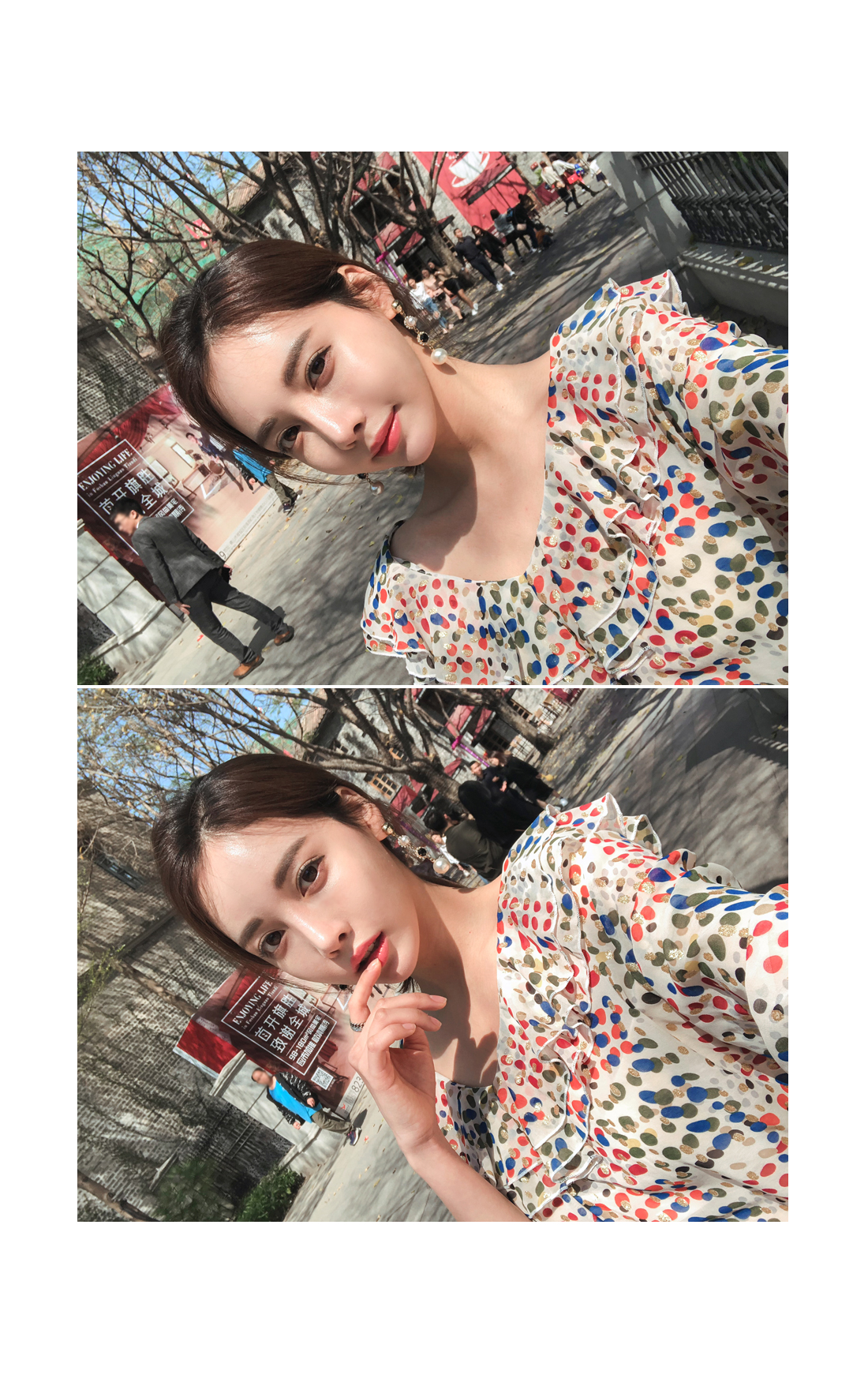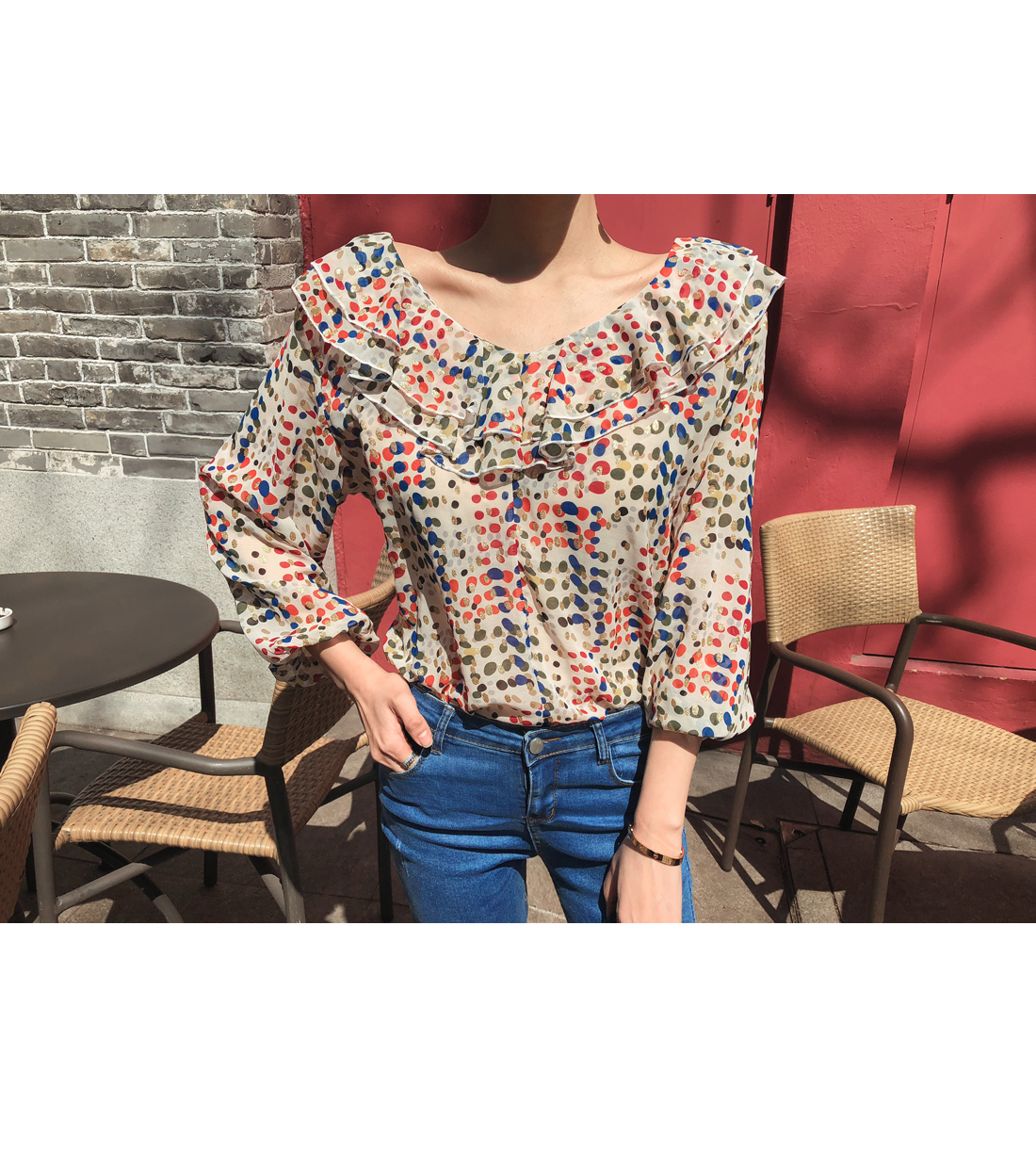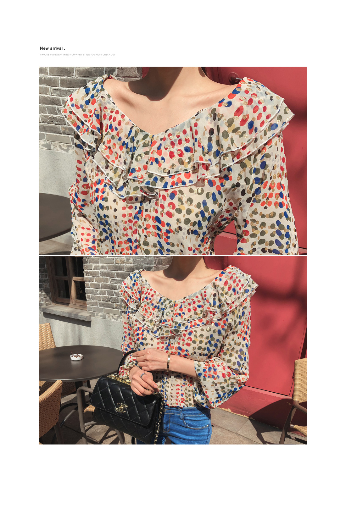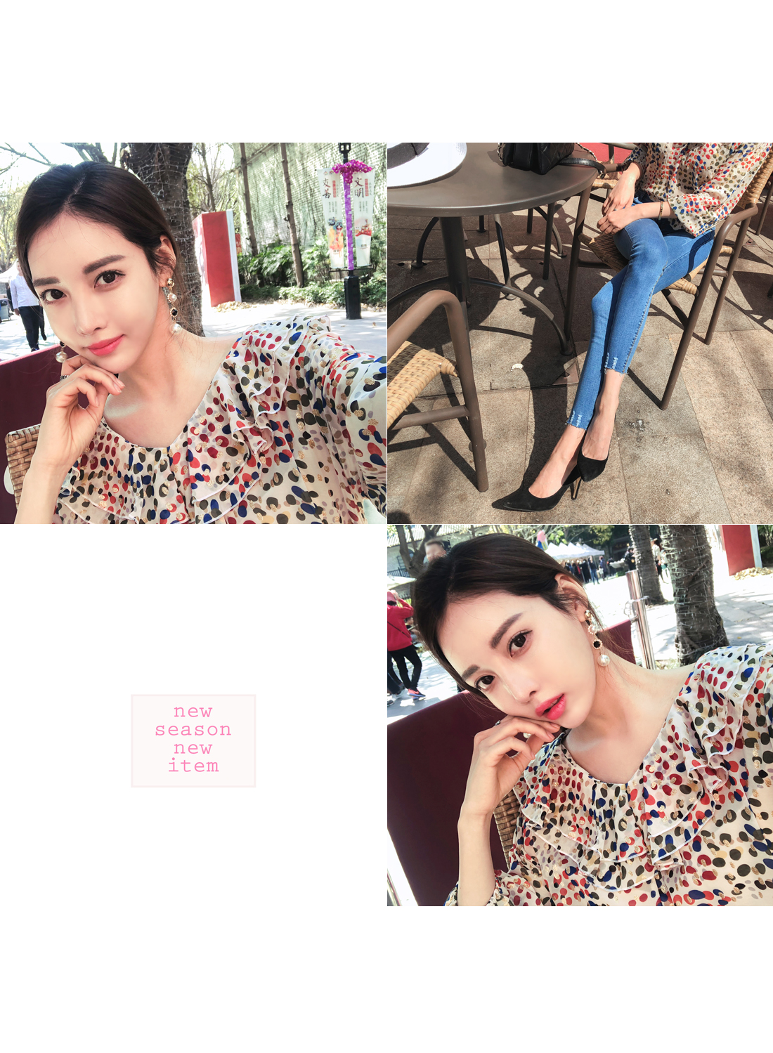 여성스러움이 물씬 느껴지는 패턴 블라우스 소개할게요.쇄골라인이 돋보이는 라운드 네크라인으로 제작되었구요따로 클로징 없이도 손쉬운 탈,착용을 도와드리구요!전체적으로 여유있는 핏과 적당한 기장감으로부담없이 편안하게 즐기기 좋구요다양한 컬러감의 도트 패턴이 더해져여성스러운 분위기를 UP- 시켜주었답니다!네크라인 아래로 캉캉으로 떨어지는 프릴디테일로 여성스럽게 디자인해 주었으며소매부분에도 프릴로 포인트해주었어요!~안감이 따로없어 부담스러우신 분들은 이너착용 권장해드릴게요!모델처럼 팬츠는 물론-! 스커트나 슬랙스 등 다양한 하의 아이템과 매치하여 멋스러운 룩을 완성할 수 있을거에요.아이보리, 블랙 두가지 컬러 준비했으며모델이 착용한 컬러는 아이보리 입니다.