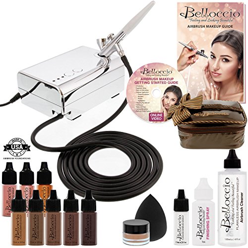 -. Title : Belloccio Professional Beauty Airbrush Cosmetic Makeup System with 5 Dark Shades of Foundation in 1/4 oz Bottles - Kit includes Blush, Bronzer and Highlighter and 3 Free Bonus Items and a DVD