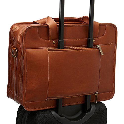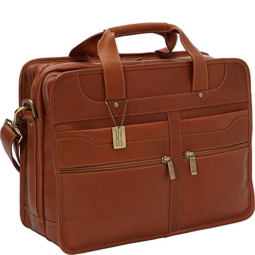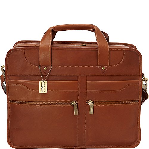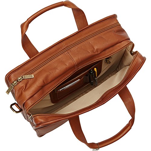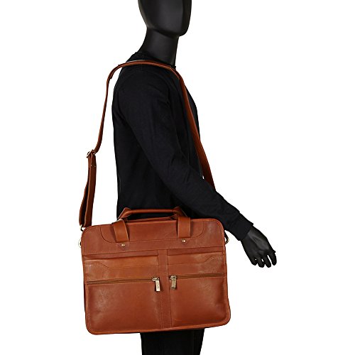 -. Feature : Fully lined, antique brass hardware, two zippered compartments, double handles for carrying and adjustable, removable shoulder strap / First zippered compartment has zippered leather pocket, open leather pocket, three leather holders for pens and pencils, open leather slot for business cards and key holder / Second zippered compartment expands when opened. Has padded laptop area (14 inch x 11 inch x 2 inch) with Velcro closure / Two front zippered pockets and two pockets with magnetic snap closure / 17x7x13
