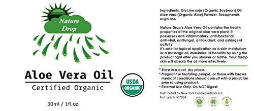 -. Title : Nature Drop's USDA Organic Aloe Vera Oil - 1 oz - 100% pure , Vitamin C, E, B, allantoin, minerals, proteins, polysaccharides, enzymes, amino acids and beta-carotene.