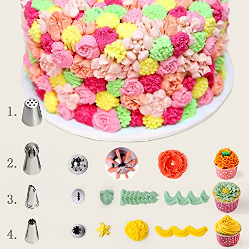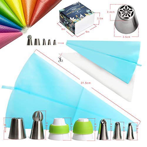 - A total of 56 pieces of accessories, 33 decorating mouth contains 27 large Russian decorating mouth, 2 leaves decorating mouth, 2 toothed decorating mouth, 2 ball decorating mouth, a large three-color converter, A medium converter for spherical decorating nozzles, 1 silicone bag, 20 disposable piping bags. High hardness packaging gift box plus paper operation guide