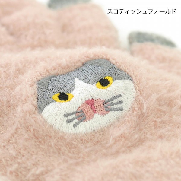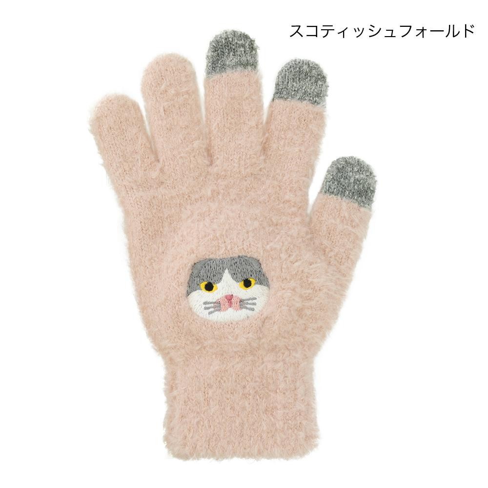 | 親指、人差し指、中指にスマホ対応加工が施されていて、着けたままスマートフォンが操作可能な手袋です。もふもふっとしたとっても気持ち良い肌触り。ねこ好きさんにはたまらない可愛い顔を刺繍しています。 |