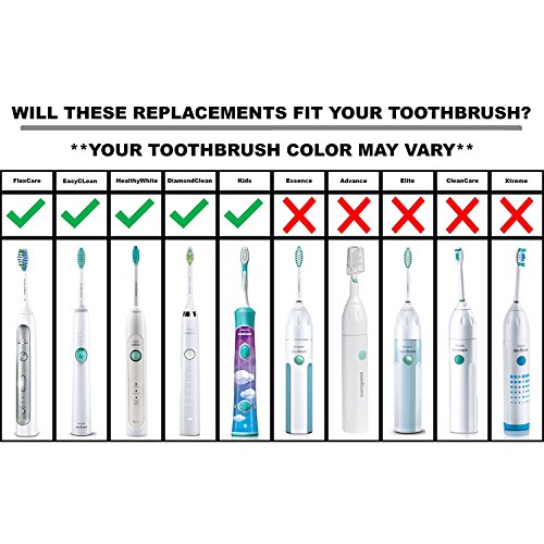-. Feature : PROTECT YOUR SMILE - Better at removing plaque and decreasing the chance of gingivitis when compared to a manual toothbrush. (Most comparable Amazon product to Philips Toothbrush Heads) / FUNCTIONAL DESIGN - Our Sonicare Diamond Clean Toothbrush Replacement Heads have a unique contoured field of bristles that are designed to fit the natural shape of your teeth. This advanced technology help you achieve that perfect smile! / HIGHLY COMPATIBLE: Sonicare 2 Series Plaque Control, Sonicare 3 Series Gum Health,DiamondClean, EasyClean, (NOT Compatible with Essence), FlexCare, FlexCare+, FlexCare Platinum, HealthyWhite and HydroClean Philips Brush Handles / SUPERIOR QUALITY: The quality of our Premium Replacement Toothbrush Heads is the MOST comparable to Philips Sonicare / REMINDER BRISTLES: Our unique reminder bristles will fade when a replacement is needed, generally after three months of use