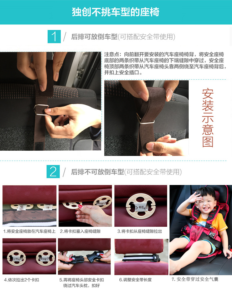 u0026nbsp; 1. The head of the head pillow design, shoulder pads, crotch design, soft and comfortable; 4. With the car three-point seat belt to use, easy to carry, easy to install; 2 simple shoulder strap adjustment system;Safe and reliable; 5. Fabric comfortable and breathable.