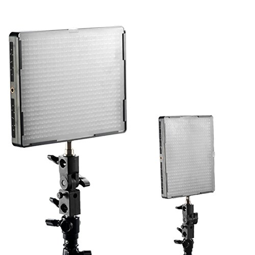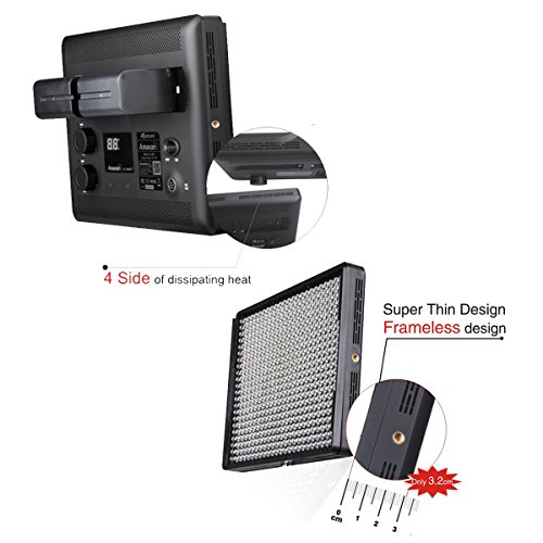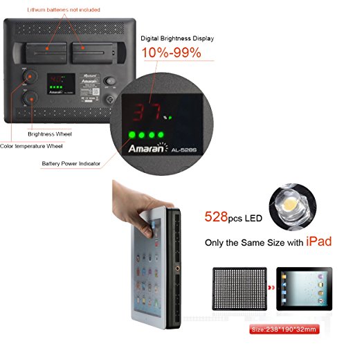 - Feature : Spot lighting, Beam Angle 25. High color rendering LEDs (Ra>95). / High efficiency, energy saving bulbs, PWM technology for low power consumption. / Double power supply system, charges batteries when powered by AC, battery power indicator. / Digital brightness display, brightness wheel. Efficient heat dissipation, Long lifespan and steady light. / Slim design, only the size as Ipad, including Universal lamp bracket, Diffusing filter and warming filter (3200K) and Carrying case.