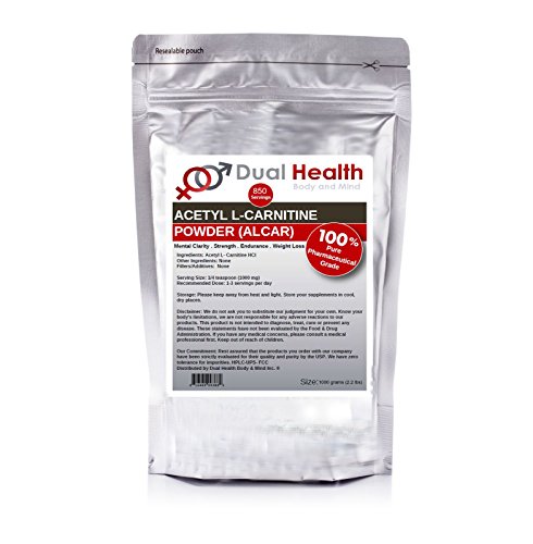 -. Binding : Health and Beauty -. Brand : Dual Health Body & Mind -. Color : White -. EAN : 0634030188461 -. Feature : Guaranteed 100% Pure. No Fillers or Additives. / Double Factory Sealed For Freshness. / Lab Tested and Verified. / Pharmaceutical Quality Grade. / Free Shipping inside the USA. -. IsAdultProduct : 0 -. Label : Dual Health Body & Mind Inc. -. LegalDisclaimer : Disclaimer: We do not ask you to substitute our judgment for your own. Know your body's limitations, we are NOT responsible for any adverse reactions to our products. This product is not intended to diagnose, treat, cure or prevent any disease. These statements have not been evaluated by the Food & Drug Administration. If you have any medical conditions, please consult a medical professional before buying. -. Manufacturer : Dual Health Body & Mind Inc. -. PackageQuantity : 1 -. ProductGroup : Health and Beauty -. ProductTypeName : HEALTH_PERSONAL_CARE -. Publisher : Dual Health Body & Mind Inc. -. Size : 1000 grams -. Studio : Dual Health Body & Mind Inc. -. Title : Pure Acetyl L-Carnitine (ALCAR) Powder (1 kilogram (2.2 lbs)) Bulk Supplements -. UPC : 634030188461