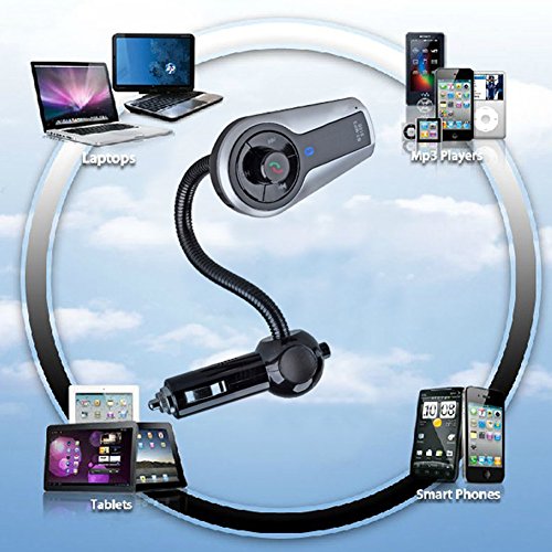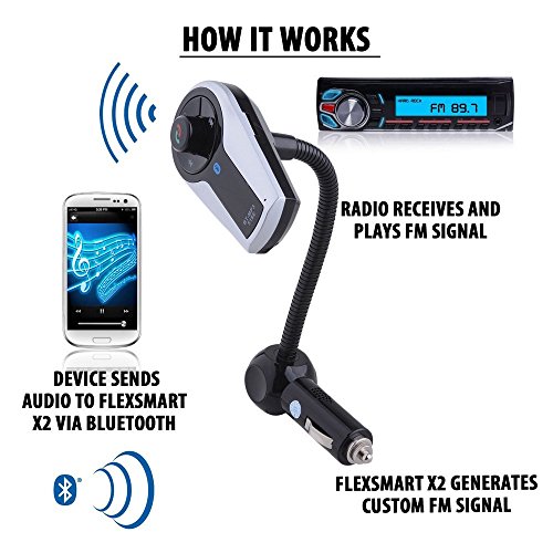 The FM transmitter plugs into and grips your DC outlet, so you'll always have a secure fit. The flex neck is tough but allows you to get the perfect angle no matter what setup you have. And for your non-Bluetooth devices, use the included 3.5 Aux. cable to plug into the Line-In port of the FM transmitter, then transmit your music without worrying about adapters, tapes or CDs.