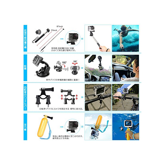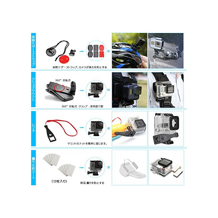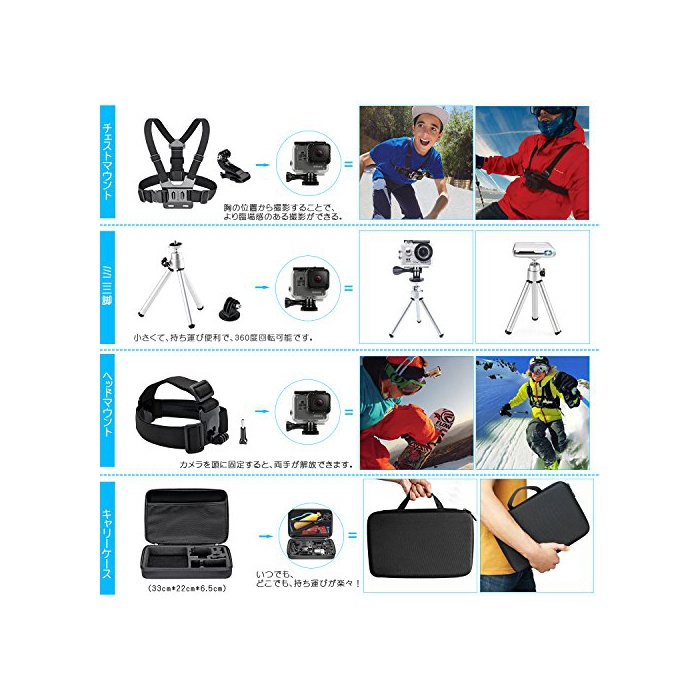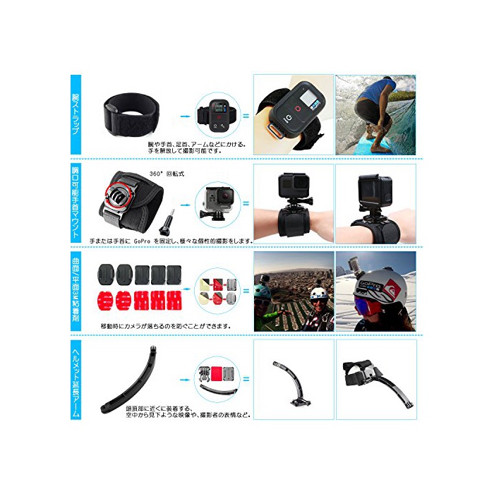 2,응용 범위 넓다:아웃도어 스포츠에 있어서 필요한 악세사리 세트입니다.스카이다이빙/수영/써핑/사이클링/스키/등산/스노보드 등에 최적입니다.자촬영봉이나 삼각 등 평상시 사용이 많은 파트도 이 키트에 존분있기 때문에,평상시의 생활 촬영으로도 추천입니다.