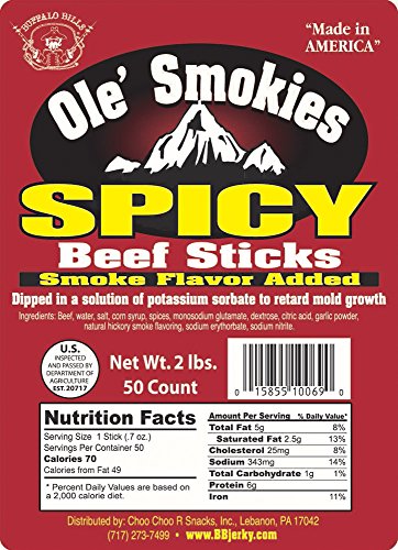 -. Feature : 2 lbs of our Buffalo Bills 5" Ole' Smokies (50 beef sticks per saddlebag) / Mild flavor beef sticks with a big beefy taste - made with 100% US beef / Premium "twist-end" beef sticks with an old-fashioned flavor and quality / USDA inspected and approved - only 1 carb and 65 calories per stick / Buffalo Bills Ole' Smokies Saddlebags - available in 4 flavors (Honey Stung, Mild, Spicy & Teriyaki)