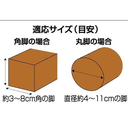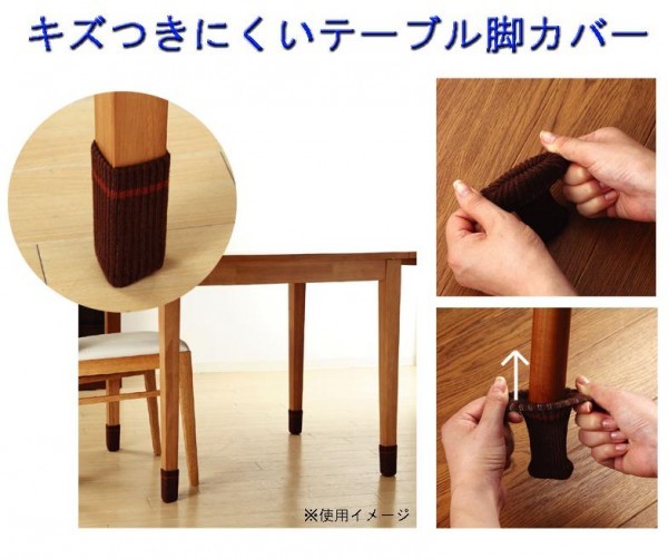 | テーブル脚にスッポリはかせるだけでフローリングや畳のキズを防ぎます。ぴったりフィットのリブ網みで、丈夫な2重構造。約3~8cmの角脚、直径約4~11cmの丸脚に対応します。 |