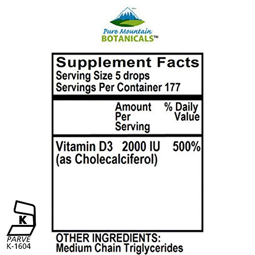 -. Feature : CONVENIENT: Easy Dropper dispenses 2000 IU of vitamin D liquid ( as Cholecalciferol ) in every serving. Liquid Vitamin D3 for All Ages - kids children and adults. / UNFLAVORED -Mix the liquid vitamin d3 with your favorite juice or just take it directly in your mouth supplying 2000 I.U. of kosher vitamin d daily. / TRUSTED - MADE IN USA: Our vitamin D3 drops are KOSHER and GLUTEN FREE. Made with NO Harsh Preservatives, Fillers or Flowing Agents - NO Sodium Benzoate, NO Magnesium Stearate, NO GMOs / FEEL SECURE: Try the Best - Risk Free! These Vitamin D3 liquid drops and ALL Products from Pure Mountain BotanicalsTM are covered by a no-questions asked manufacturer's money back guarantee.