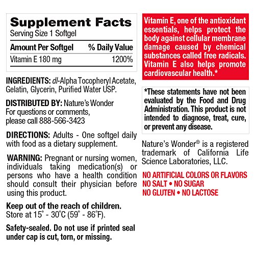 Product DescriptionNature's Wonder Vitamin E 180mg. Supports heart health. Equivalent to 400IU.0