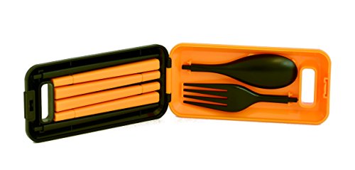 -. Feature : Compact travel eating utensil set with storage case / Includes a reusable plastic fork, spoon, and pair of chopsticks / Utensils are easy to assemble and put away, snap firmly into the case / Great for school, work, or travel / Includes bonus sanitizing wipe for easy cleanup; sanitizing wipe made in the USA