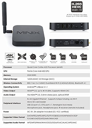 Quad-Core Cortex A53 Processor with Penta-Core Mali 450 GPU. Dual-Band 802.11ac 2 x 2 MIMO Wi-Fi (2.4Ghz/5.0Ghz). 16GB eMMC 5.0 (MLC). Android 5.1.1 Lollipop OS. HDMI 2.0 output for up to 4K @ 60Hz FPS video experience XBMC Kodi Android device.