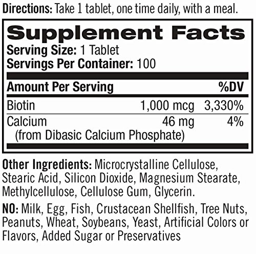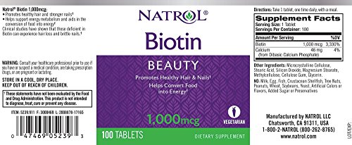 Natrol Biotin supports healthy luxurious hair, beautiful skin, and strong nails, in addition to energy production. A water-soluble B-complex vitamin, biotin is necessary for cell growth and the production and metabolism of fat into amino acids. Natrol Biotin provides 1,000 mcg to help ensure the daily need for this essential nutrient is met. 100% Drug Free! Natrol makes this product in the U.S.A.!Feature