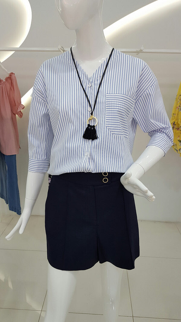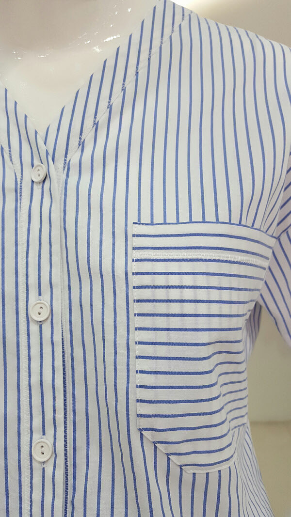 시원한소재에 브이넥 스트라이프 셔츠입니다날씬하게보이는 효과를 낼수있는 패턴이며 7부소매라 한여름에도 충분히 입을수있는 아이템이예요 정장바지 반바지 청바지와도 함께 매치시킬수있는 디자인입니다