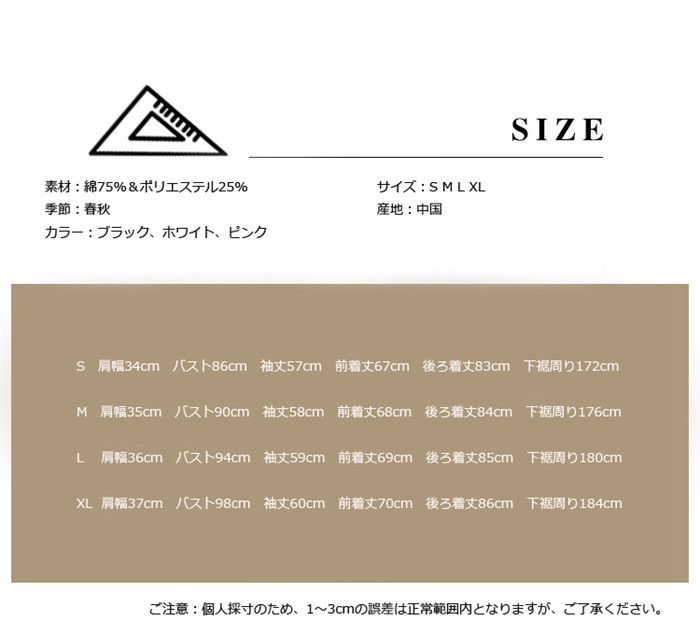 カットソー レディース 長袖 カットソーTシャツ 無地 トップス 大きいサイズ ゆったり カジュアル 春物 2018春夏新作 カットソーTシャツ レディース トップス 大きいサイズ商品詳細素材:綿75%&ポリエステル25%季節:春秋カラー:ブラック、ホワイト、ピンク サイズ:S M L XL産地:中国サイズ参照表S 肩幅34cm バスト86cm 袖丈57cm 前着丈67cm 後ろ着丈83cm 下裾周り172cmM 肩幅35cm バスト90cm 袖丈58cm 前着丈68cm 後ろ着丈84cm 下裾周り176cmL 肩幅36cm バスト94cm 袖丈59cm 前着丈69cm 後ろ着丈85cm 下裾周り180cm XL 肩幅37cm バスト98cm 袖丈60cm 前着丈70cm 後ろ着丈86cm 下裾周り184cmご注意:個人採寸のため、1~3cmの誤差は正常範囲内となりますが、ご了承ください。カットソー レディース 長袖 カットソーTシャツ 無地 トップス 大きいサイズ ゆったり カジュアル 春物 2018春夏新作 カットソーTシャツ レディース トップス 大きいサイズ