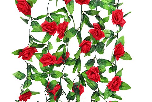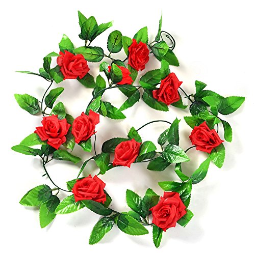Artificial Rose Silk Flower Green Leaf Vine Garland Home Wall Party Decor Wedding Decal (Red)