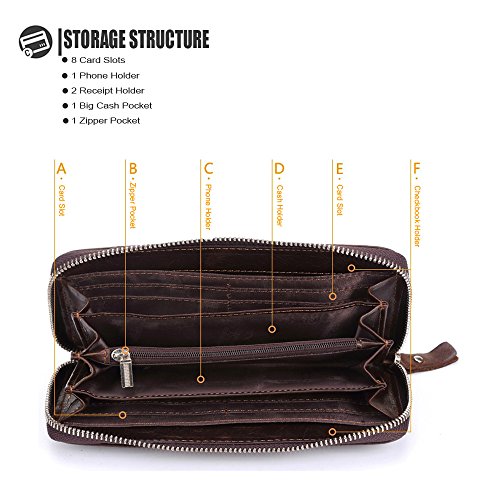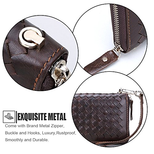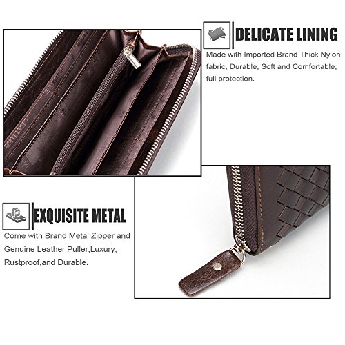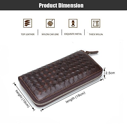 - Feature : Material: 100% First layer Cowhide Genuine Leather, Wonderful Woven Hand-Made workmanship, elegant in texture and soft to the touch, durable and luxury. / Size: 19cm×10cm×2.5cm / Come with Brand Metal Zipper with Genuine Leather Wrist Strap, Luxury, Rustproof, Smoothly and Durable. / Structure: Main Section with a zipper closure, comes with a zipper pocket and 2 big compartments which you can put it for cash and hold 5.5'' cell-phone or less , 2 receipt holders and 8 card slots. / This wallet is gorgeous with its fashionable style, it can be used in both business and casual occasion.